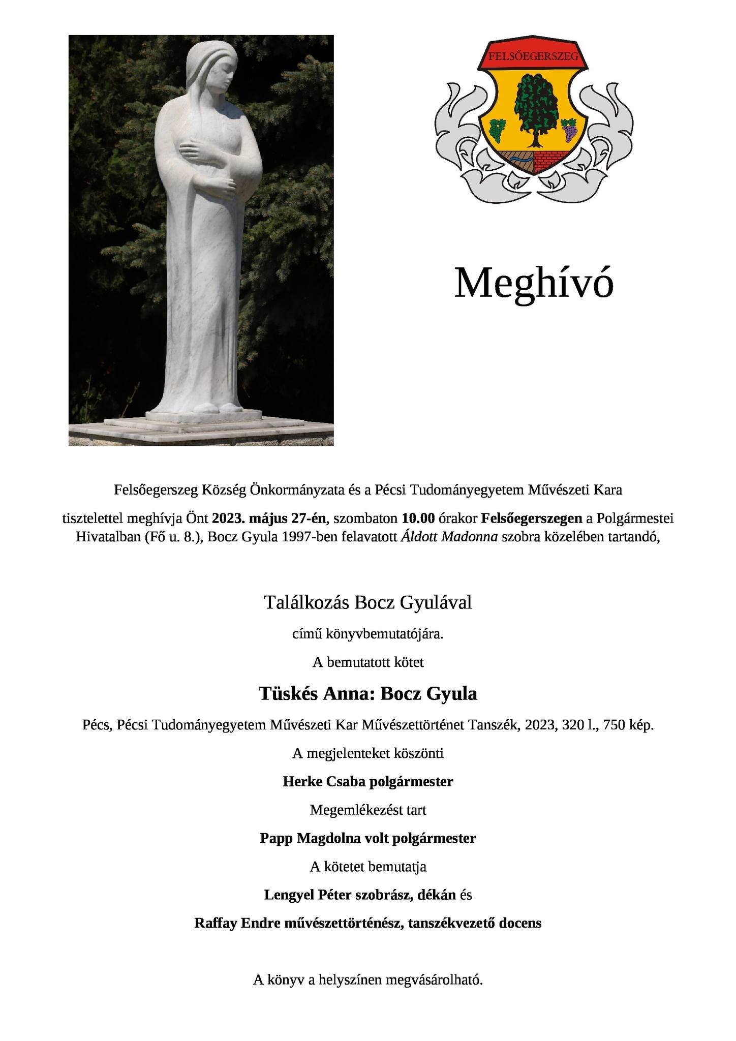 Felsőegerszeg Község Önkormányzata és a Pécsi Tudományegyetem Művészeti Kara tisztelettel meghívja Önt