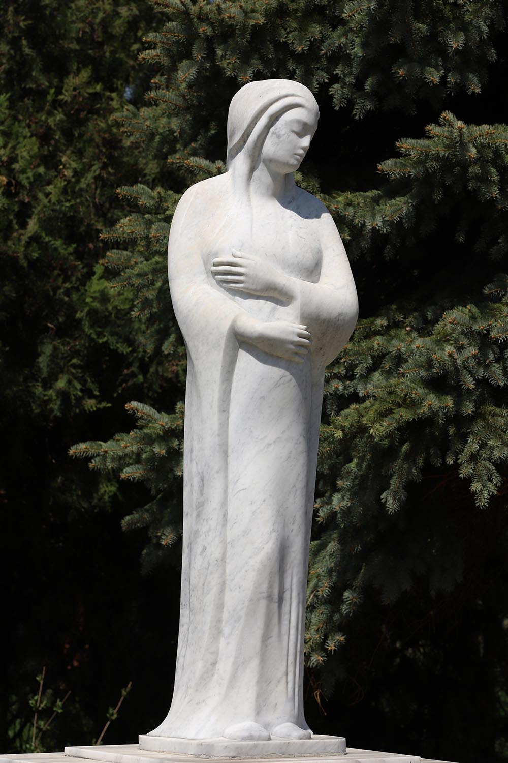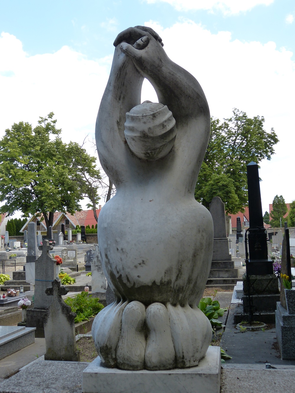 For his outdoor works, he has always chosen materials and worked with them in a way that fits in with their surroundings. He also created his small-scale sculptures in the hope of achieving large-scale realisation. A good example of this is his piece called the Praying Woman, a 33 cm high figure of a kneeling woman carved from cherry wood in 1965. He also sculpted this nearly twenty years later from Carrara marble to create a 172 cm high tombstone, which currently stands in the public cemetery in Mohács, Hungary. During his more than four decades of work, he created about thirty public sculptures and reliefs, most of which are located in Baranya County and can be found in the online database www.kozterkep.hu. He also has four public sculptures in Budapest and one in Debrecen, Komló and Mohács.